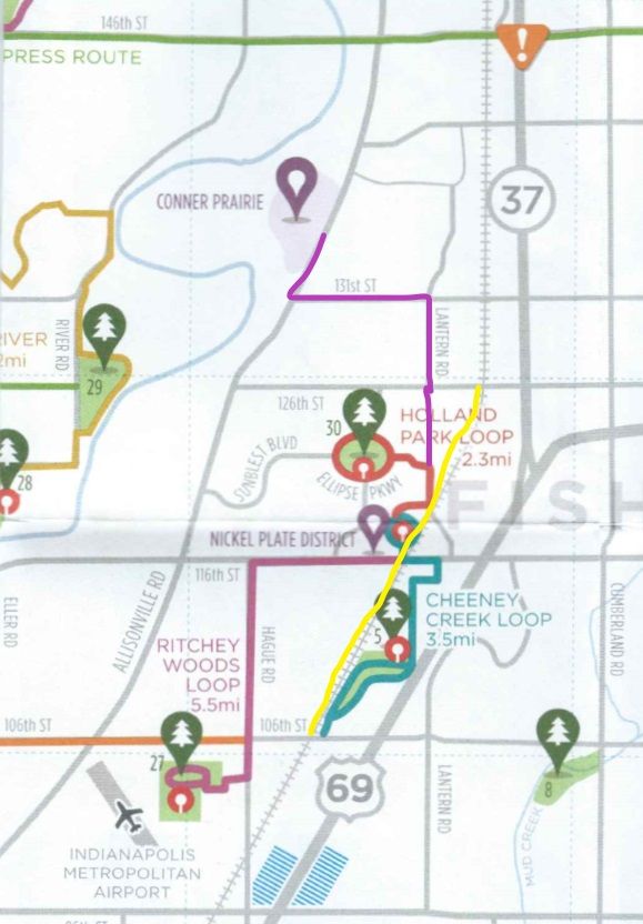 The other fork going from downtown goes from the library area north along Lantern Road. This is a newly updated trail that follows Lantern Road all the way to 131st Street, where it turns West to Allisonville. At Allisonville, the path then turns North and goes to the entrance of Conner Prairie. Why the city build a path from downtown to a facility that charges admission is unclear, but the path has been built. Currently the construction on Allisonville at 131st Street disconnects the part of the trail that is in front of Conner Prairie. That part of the path has been built and torn up (the grass and landscaping) several times in the last 12 to 18 months as road work is being done. Hopefully it isn’t tax dollars paying for the repetitive task.